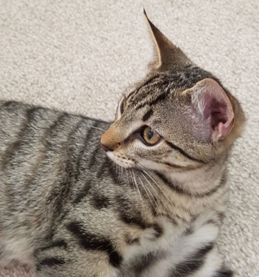 Teddy is a big handsome boy. He is super confident but very happy to share your lap if you are willing. He loves to play with toys on his own or play kitten games with his siblings. He has adjusted very well to the two adult cats at his foster home but would also be quite happy to be on his own.