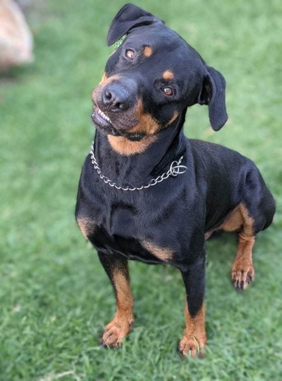 He’s a big boy weighing over 40kg with a real Rotti personality. He’ll keep you entertained as he loves to play games 🎾 and challenges 🧩. He is house trained 🚽✔️, sleeps well inside and sometimes snores 💤.