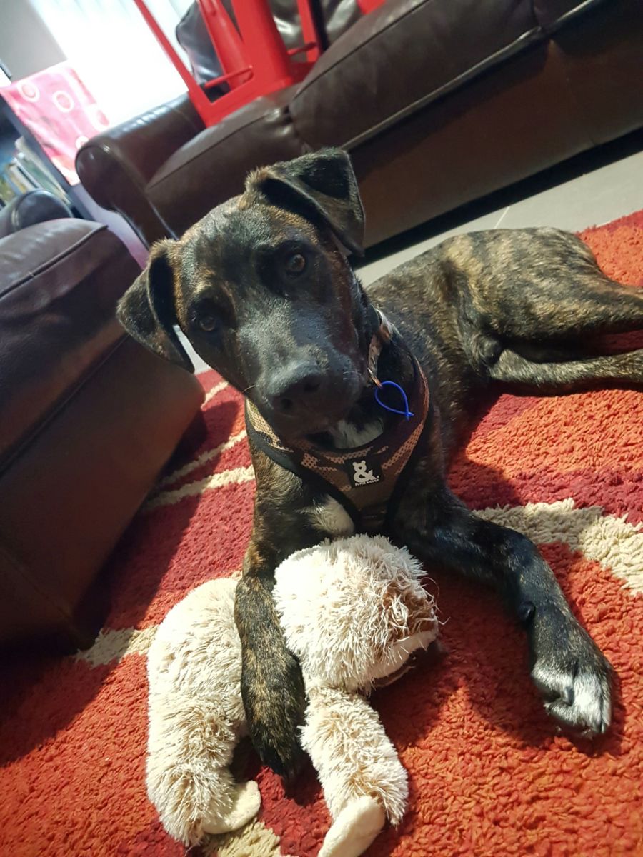 having someone that possibly works from home fulltime or just someone home, so he doesn’t get lonely and sad as he is still learning to be home on his own. We have started leaving him inside at home on his own for short periods of time, so he is starting to get used the idea & is very excited when we come home & loves to show it. A fur-sibling would be great too! Tall fencing and a fair-sized yard would mean he could run around to burn some of that energy.