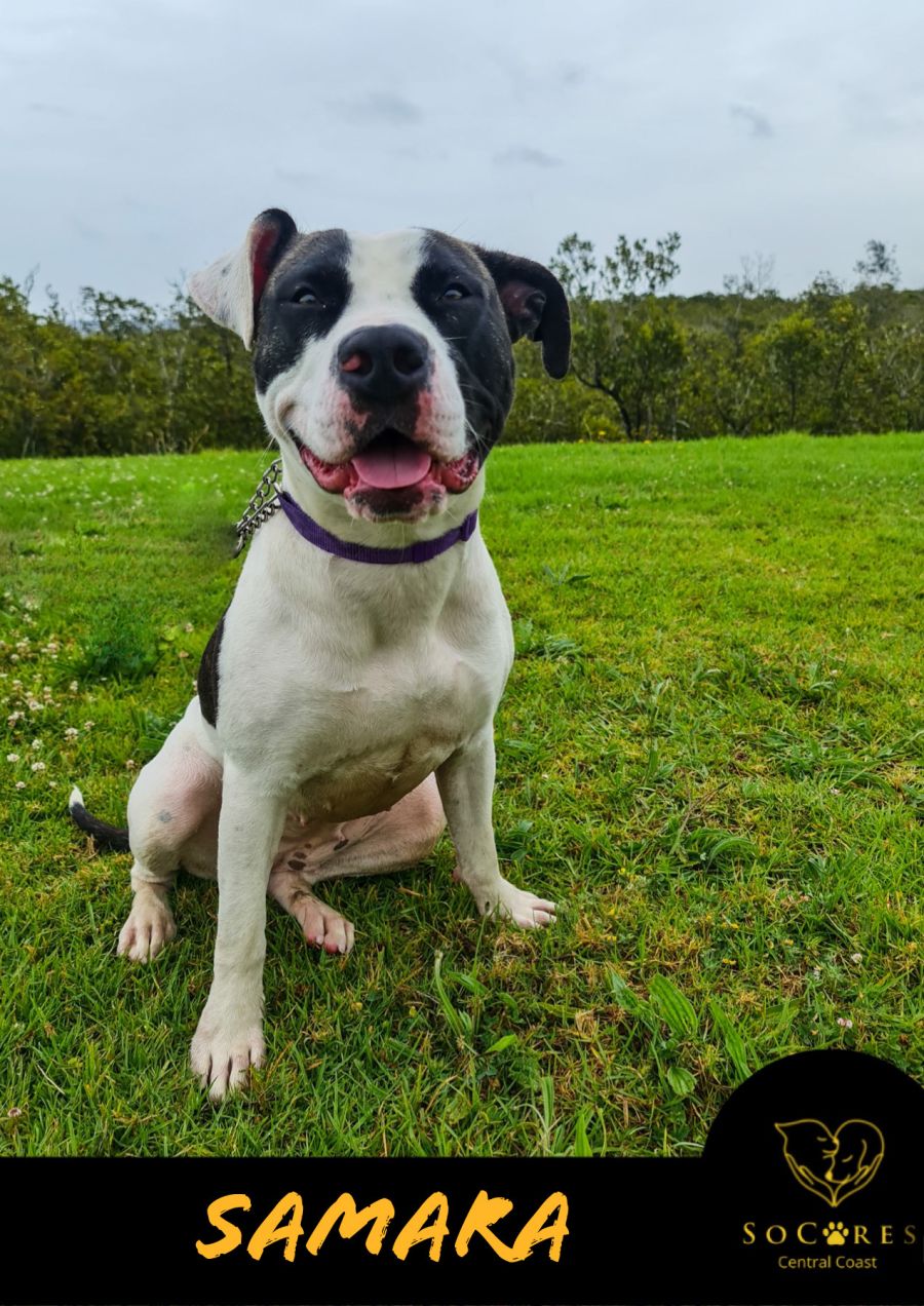 Samara is a beautiful 1 year old American Staffy x Bulldog girl who is on the lookout for her forever home. She is very excitable and has lots of energy to burn. Once relaxed and settled she does enjoy a good cuddle and bum scratches of course!
