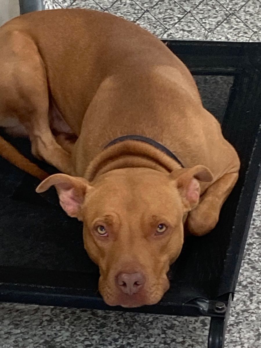 His name is Little Red and is a 2 year old American Staffordshire Bull Terrier cross that loves to play. He is dog friendly and is boisterous so would suit children 10 years and over.