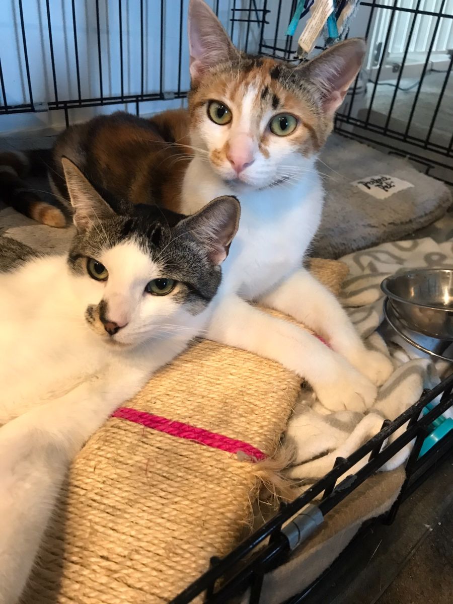 This brother (black and white tabby) and sister (calico) pair are deeply bonded best friends who cannot be separated.