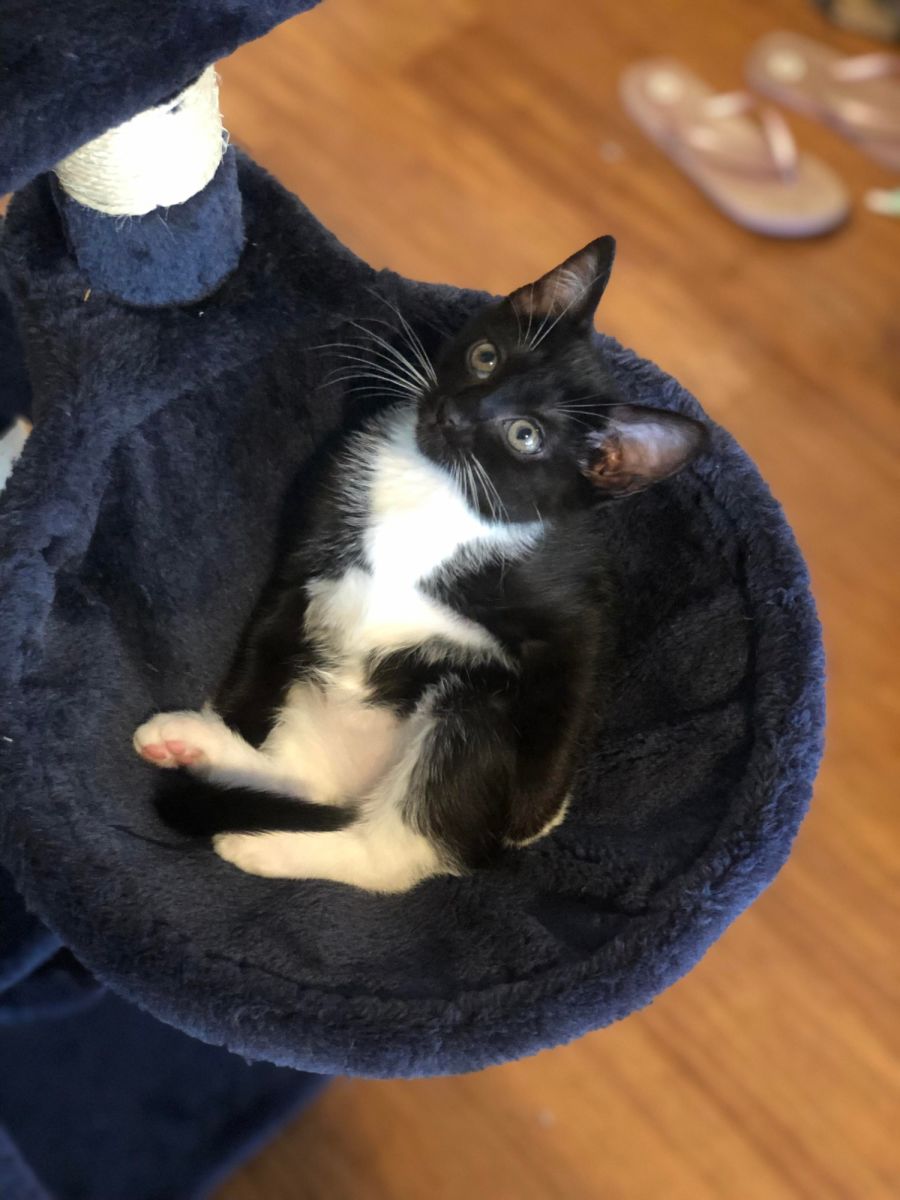 She’s often very busy exploring, playing with toys and makeshift toys, or climbing scratching posts. When she’s finished all of her important business, she loves a cuddle with her foster parents (but she’ll let you know when she can fit you in).