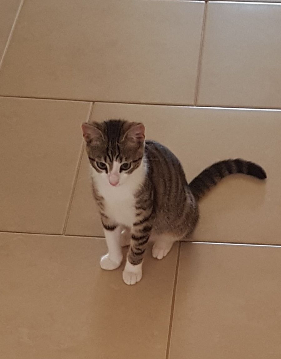 C962 Muffin is a tabby & white girl with the sweetest face. She is a little timid at first, but once comfortable in her surroundings, is happy & energetic. She enjoys playing chasing & wrestling games with her foster brother, or playing quietly with her toys.