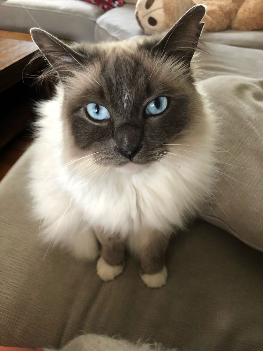 As he a Ragdoll he doesn't venture far and only stays in outdoor garden . Arlo loves to be rubbed and will cuddle up to you on the couch and climb on top of you if he's really craving attention . His favourite place to sleep is on the couch. He never liked any cat bed that we tried