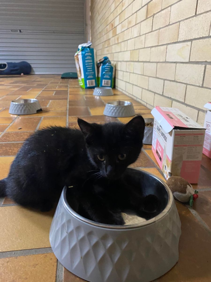 Simba is a black female kittens who loves to chase feet! She is very inquisitive and as you can see, will let you know when her food bowl is empty! Looking for a loving forever home where they will be kept inside only.