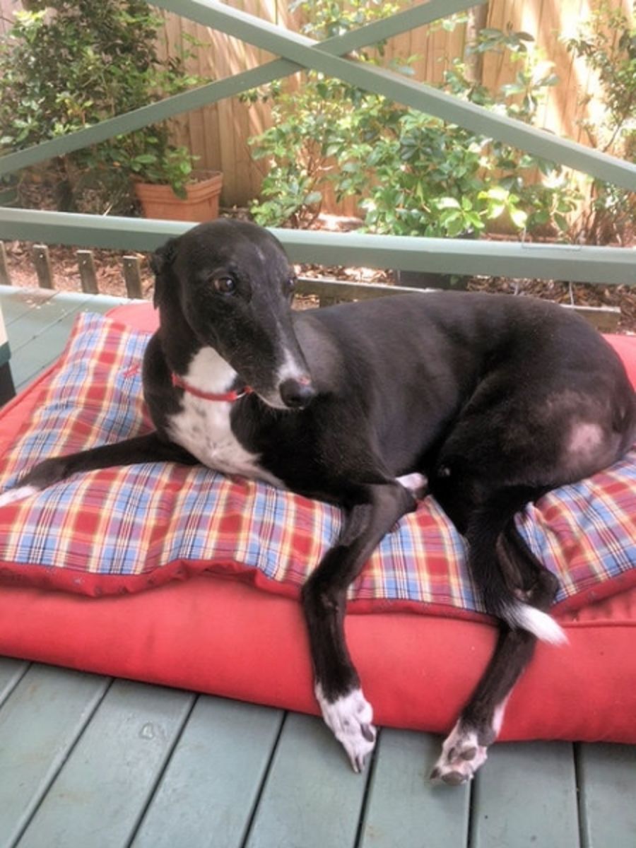 Missy is a “natural sitter” – fairly uncommon for a Greyhound. She has also spent 3-4 months living with a visiting adult cat & the two of them co-existed amiably. She has not had exposure to frisky kittens however.