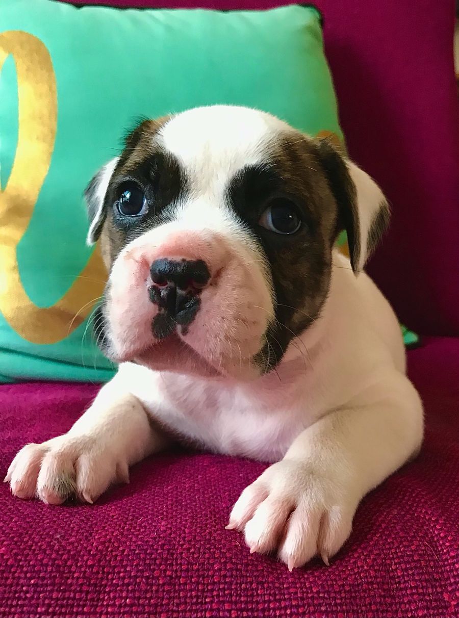 D696 Leia is affectionate, sweet & gentle. She is a little smaller than her siblings & not as rough. She LOVES her food & snuggling & was the first puppy to walk. Leia would suit a home with kids & possibly other pets.