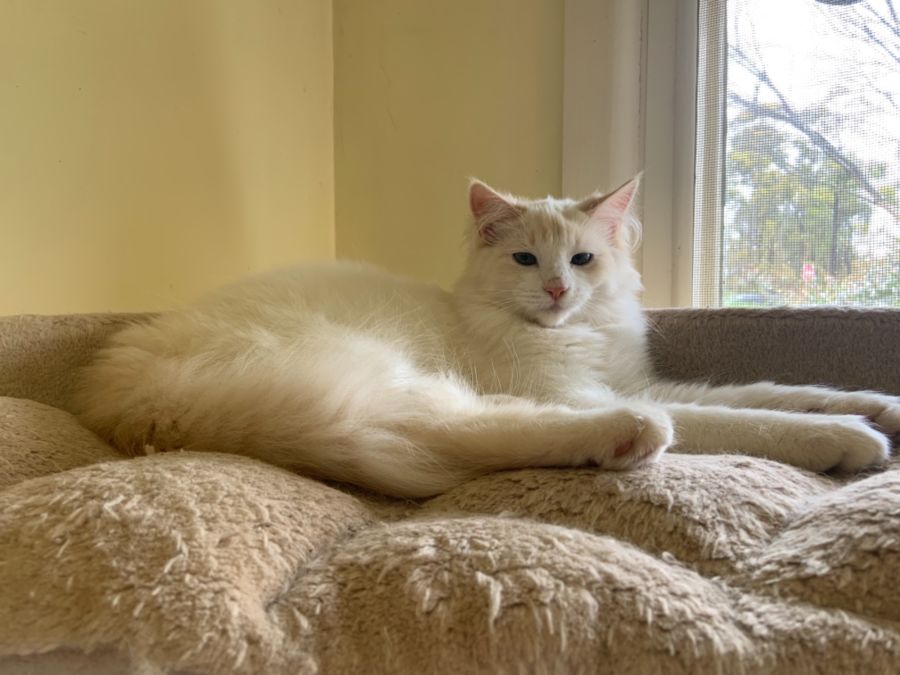 Laksa is a stunning Flame Point ragdoll who came from a feral colony where they’ve been freely breeding. Possibly inbred but that’s not unusual in any cat.