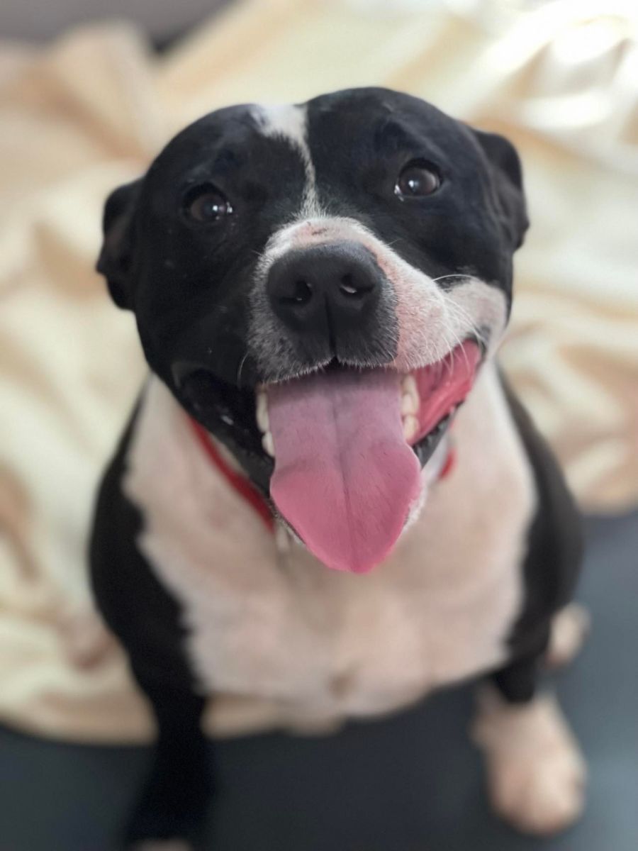 Imp 333 BB. BB is a black and white Staffordshire Bull Terrier (aka English Staffy) approx. 2 years old. He is a super happy friendly social staffy. He has alot of love to give. Loves kids and loves to play. His adoption fee if $400 includes microchipping, registration, desexing, vaccination, worming, flea treatment, a big bag of dog food, collar and lead. Please call 6583 3488 or visit during opening hours.