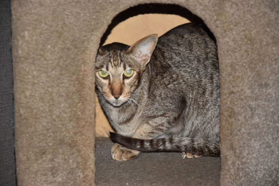 Cheetah is a top quality show cat having won many awards, who sadly found herself surrendered to the pound when her owner no longer wanted her. Because she was scared in the pound environment she was hissing at anyone who went near her so they made the decision that she would be euthanized if she wasn't accepted into foster care with a rescue group. We were contacted on a Friday and were told she would be put to sleep on the following Wednesday. Although we are over full we just had to find room for this beautiful girl! So we are now looking for a very special person to adopt her. Cheetah is best suited to a quiet home with no other pets. She may take a bit of time to get to know you and her new surroundings but once she is comfortable we believe she will be a very loving girl. Being a show cat Cheetah has had a lot of handling and will be an adoring and loyal companion to the lucky person who becomes her forever friend. Oriental cats are friendly, intelligent and inquisitive cats that love being around people. With their short coat they are easy to care for and a joy to have around. If you would like to be considered for Cheetah's forever owner please give Deb a call to find out more about her and arrange to meet her.