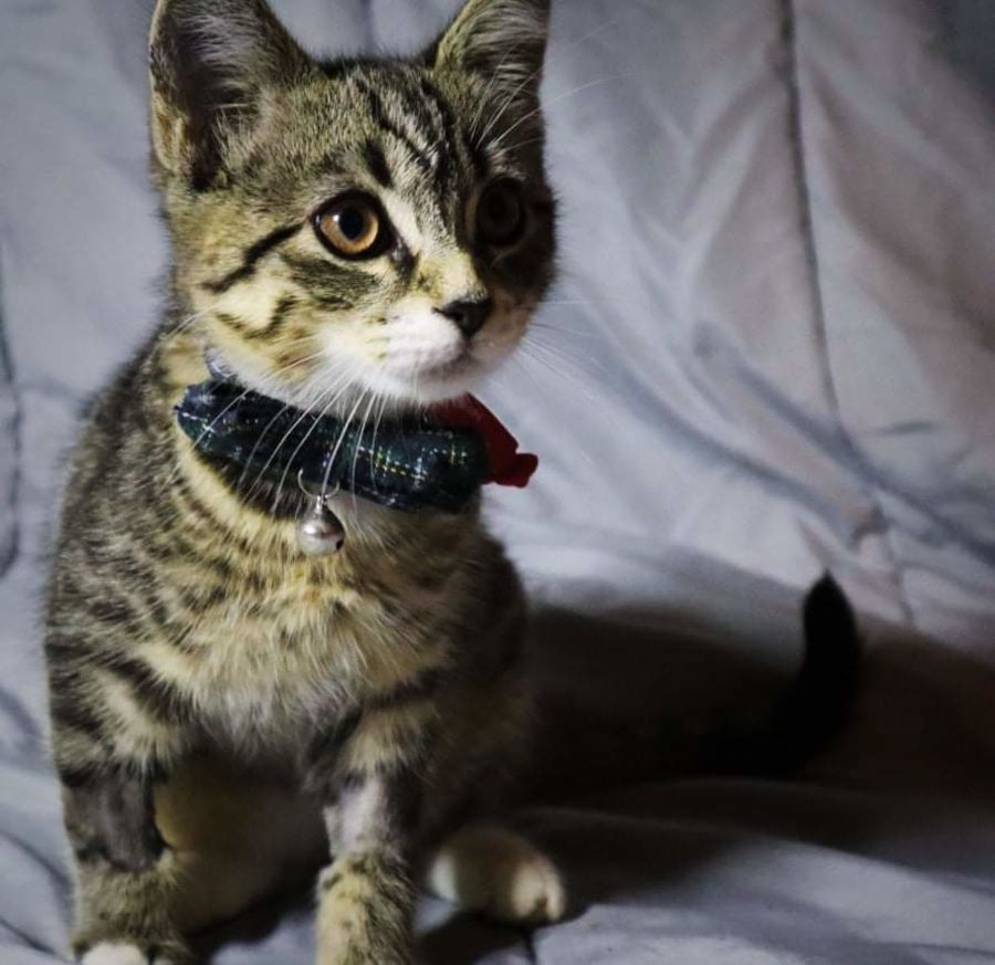 I love all the normal kitten things like flirty poles and tunnels and jingle balls. I love cat towers and snoozing in the sunny spots, all the standard kitty things, really. I have a handsome sleek brown ticked tabby coat with perfect little white socks & tummy.