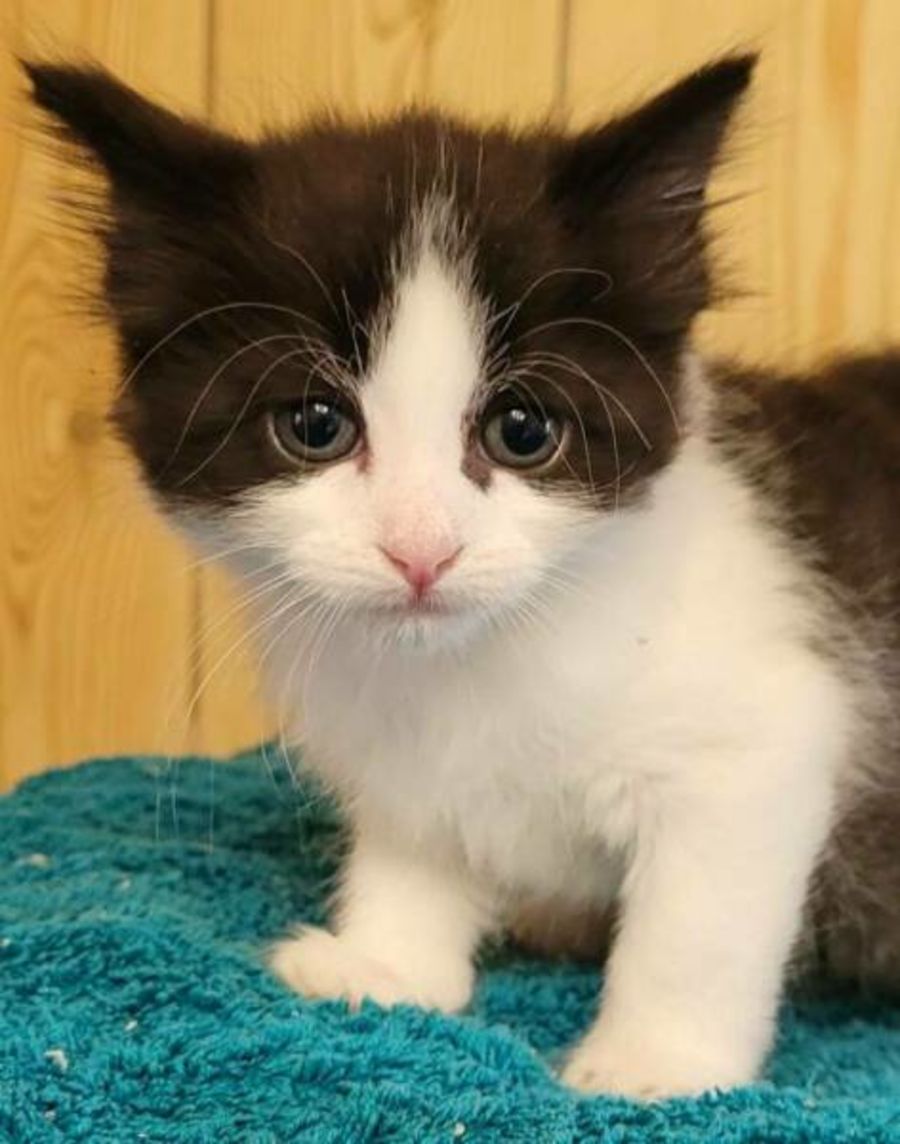 Goose is mainly black with some white patches. He is quieter than his brothers but no less adorable. Sometimes he sits back and lets them jump first, then when they are wrestling for prime position, he stalks past them with intelligence knowing he just beat them all. It is very funny. Goose has been raised with love and cuddles and affection and he is looking for a forever family who can give him this permanently.