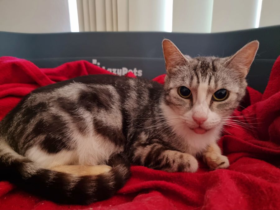 She chirps, she gives you little meows, puts her bum in the air for a pat and flops over on the regular. She is still getting used to being picked up, but she'll come straight to you and demand the pats she definitely deserves".