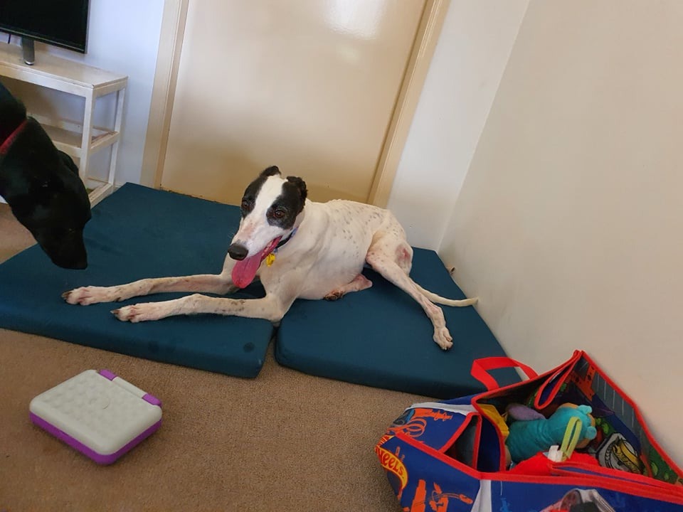 Hey, my name is Kassi! I am a petite medium-sized greyhound who LOVES being social with other doggies and humans. Not a huge fan of the feline variety so would want a home without one. I’m a quiet but playful dog and am rather outgoing with the kids but then I will want my timeout on my own to relax.