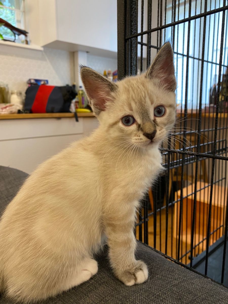 This little guy loves a good lap session - but equally loves to play. He enjoys rearing up on his hind legs and battling toys, hands, legs and pillows. He calls out for attention and will happily sit on your lap while you work. He's quick to purr, and loves to be pet, rubbing his head into your hand and quickly flipping over for a belly rub. His favourite thing in the world is helping with the litter box cleaning. He could be in the middle of breakfast and he will come running when he hears the litterbox being cleaned. He is also quite fond of watching television and has a very even temper for his young age.