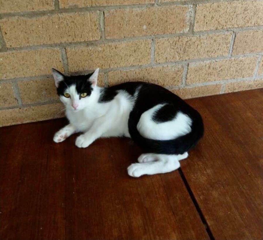 Found in a hay shed with a can firmly wedged on his head and terrified. He had settled into domestic life well.
