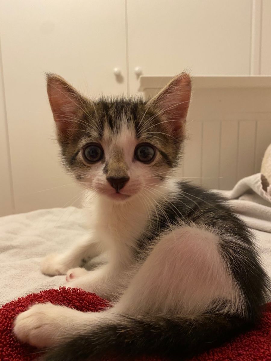 Soba is a bicolour tabby with a patch on his nose. He's very active and loves to play and cuddle. His favourite activity is eating, and he and his brother are both very sturdy and healthy. He has been fostered with other cats and a large dog, and gets along well with them. He is very chill and well behaved. Soba is litter trained.