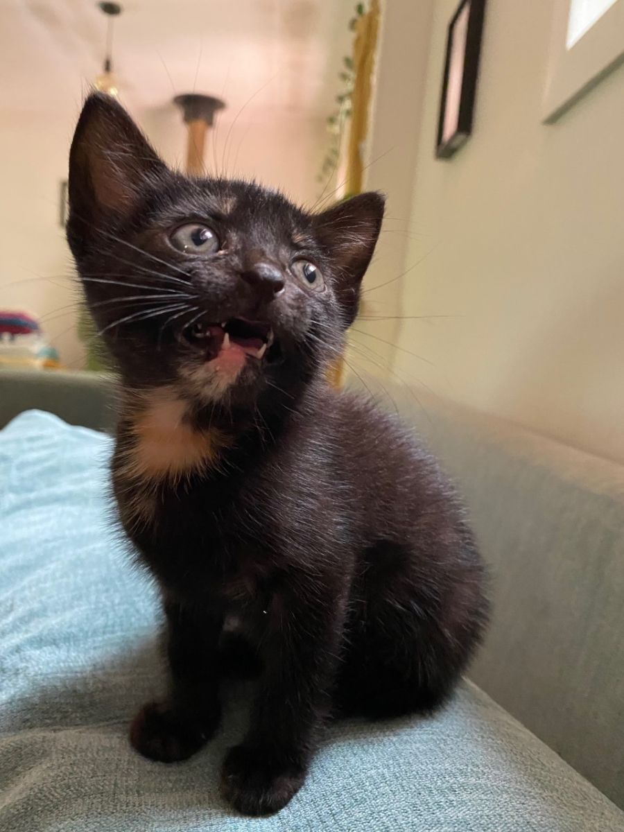 Katsu is black with a pink streak on her neck. She's the smallest of her litter, but extremely affectionate and adventurous. She likes to play with her siblings, but her number one activity is sleeping on your lap. She has been fostered with other cats and a large dog, and gets along well with them. Katsu is litter trained.
