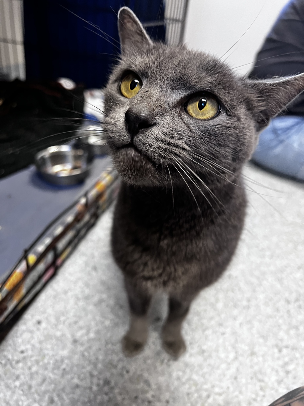 I have a beautiful Silver coat, with piercing yellow eyes. I am a Russian Blue cross, this is a unique breed that originated from Russia, they are very intelligent cats; known to figure out how to open draws and cabinets. They are also very goofy and sweet.
