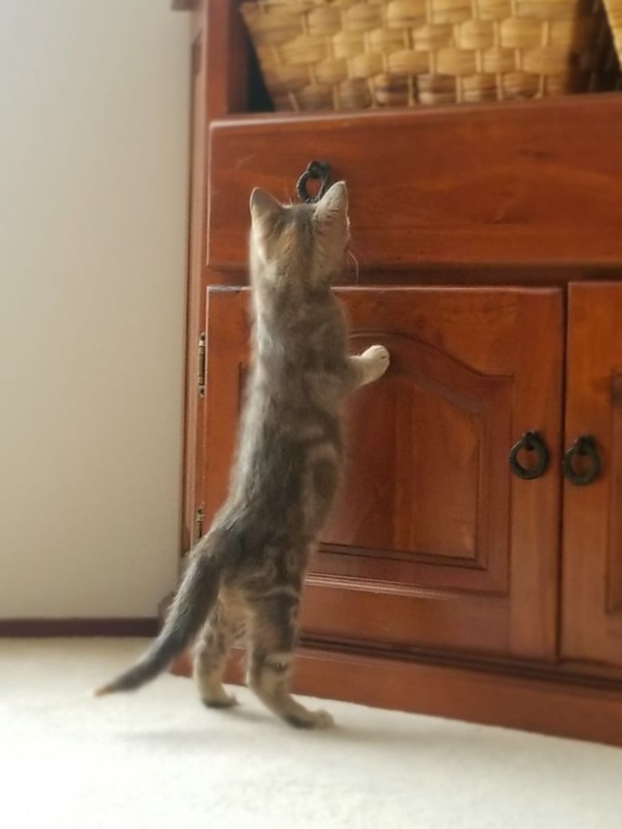 Summer was very quiet and timid when she came to us, but over the past few weeks her sweet personality is emerging. Now that she has settled into a routine Summer enjoys exploring her surroundings and playing with her siblings. If she gets startled by something Summer will hide but it isn't usually very long before she is back out exploring again. She is fine around pet-friendly dogs (though initially wary) and is very tolerant of children. She is both happy to be played with or to curl up by your side.