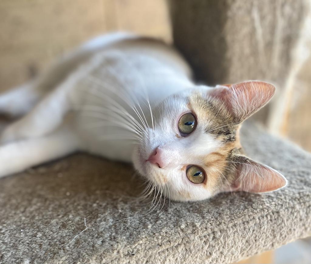 FunnyFace is a delightful, sweet and friendly little calico girl. She is so happy to see you she will shake her tail and push her head into your hand for pats and smooches. FunnyFace delights in lying around looking gorgeous in the hopes that you pat and stroke her more... she's so darn cute it's impossible to ignore her!