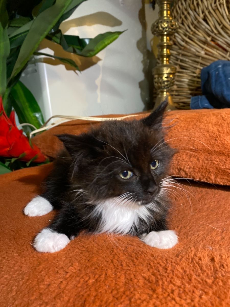 Pimms loves to be adventurous & chase his siblings around. He is so fast at times that all you see is a black fluff ball running around! He’s been around other cats & children. He’s litter trained & cheeky