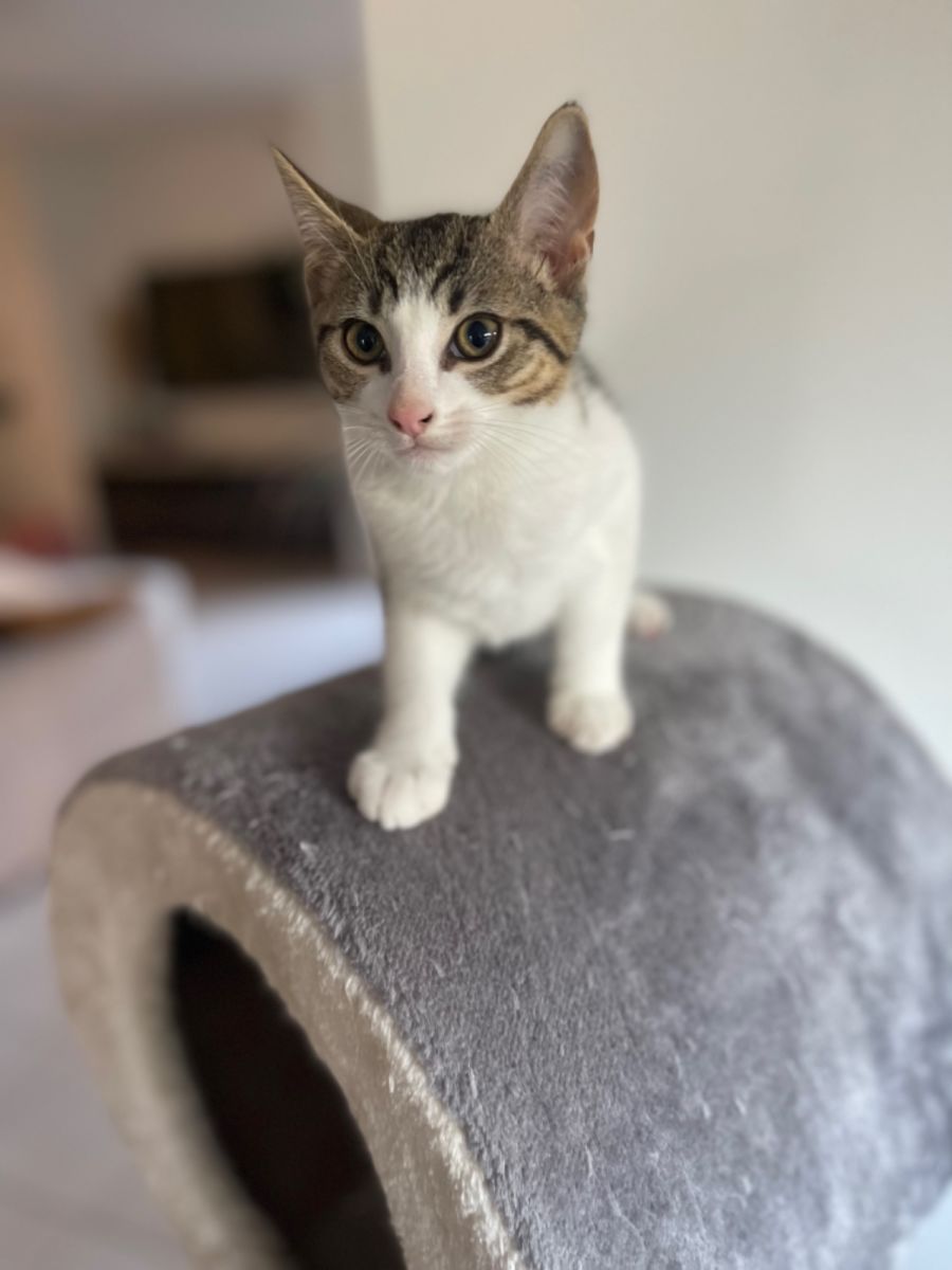 My fosters carers tell me that I’m a sweet soul who loves everyone and loves to pur when having cuddles. I’m really confident and love to play with other kittens and my siblings. I really enjoy playing with my human foster carers and their cat toys and after I’ve played I love nothing more than to have a nap in a cosy place!