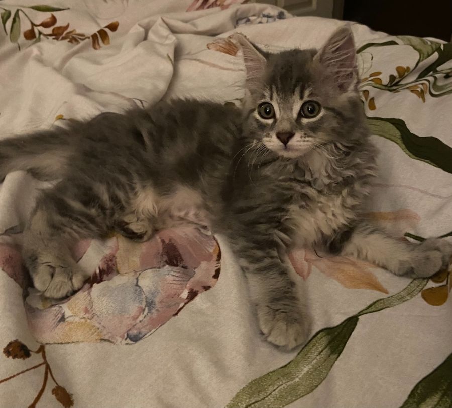 He is an absolute ball of fluff - the only long haired grey & white tabby of his litter.