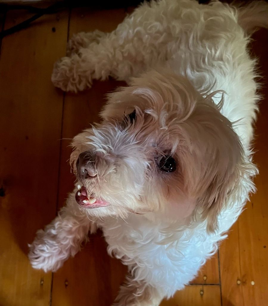 Sweet Miss Madeline is a chubby 7 1/2 year old Maltese mix who is in need of a home that will carry on her training.