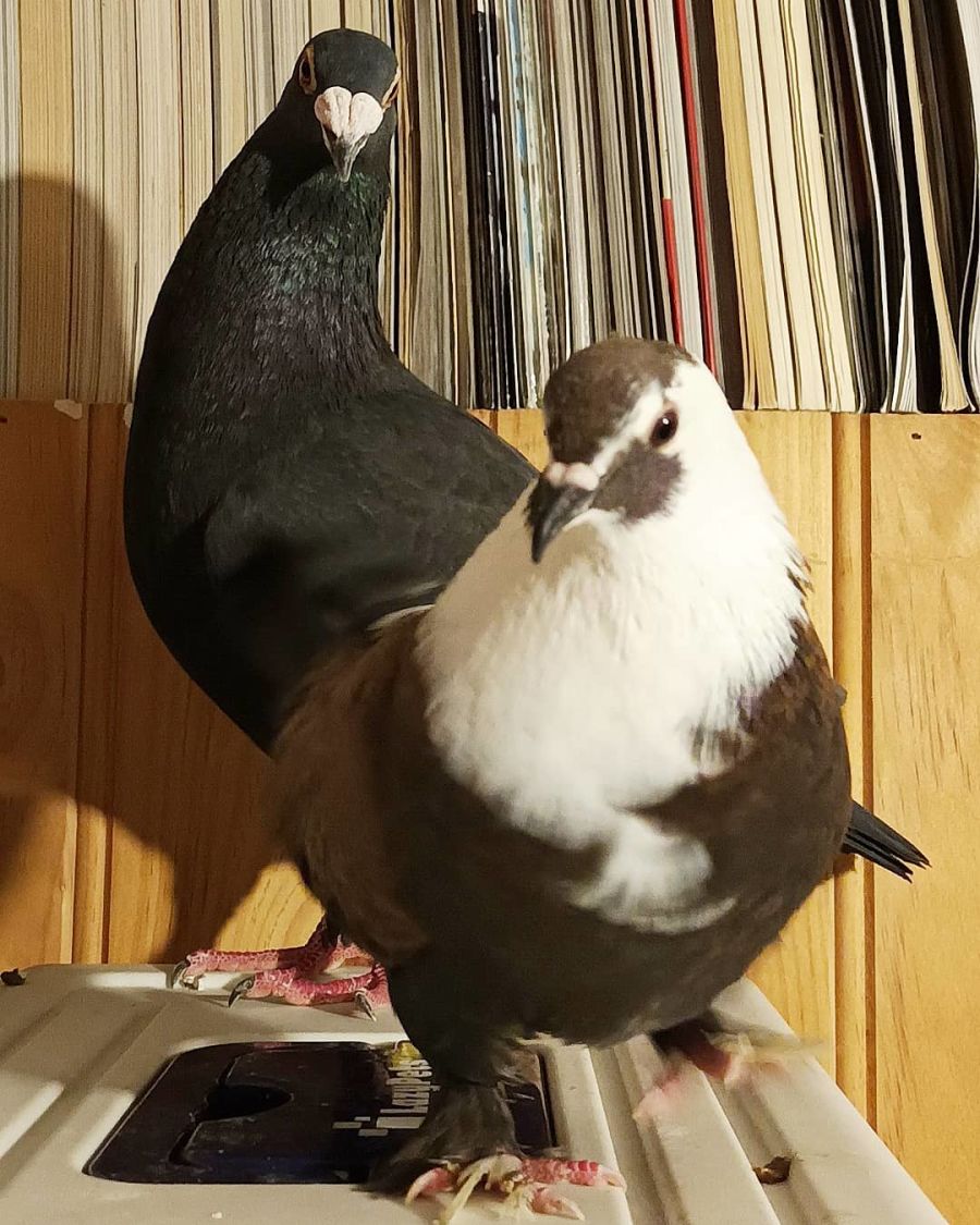 Mrs Puff is a delightful tame pigeon who loves pats and sitting on your shoulder. She fell in love with Charlie, a huge racer who broke his wing and appeared to have been dumped. Charlie can't fly more than a meter or so anymore, but that doesn't stop him being a happy and healthy bird and a good boyfriend to Mrs Puff.