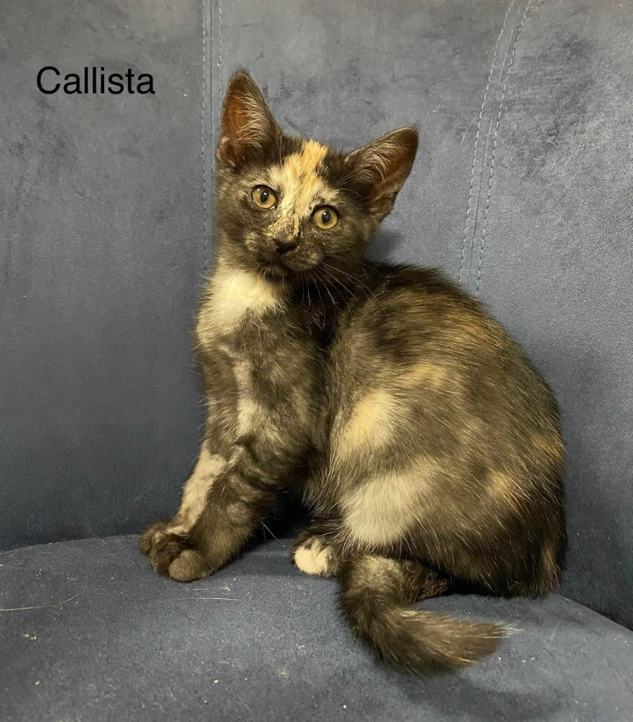 Callista is a girl tortoise shell. She too is a playful little kitten and loves playing with her siblings. She’s a mummas girl. She loves pats and is very curious.