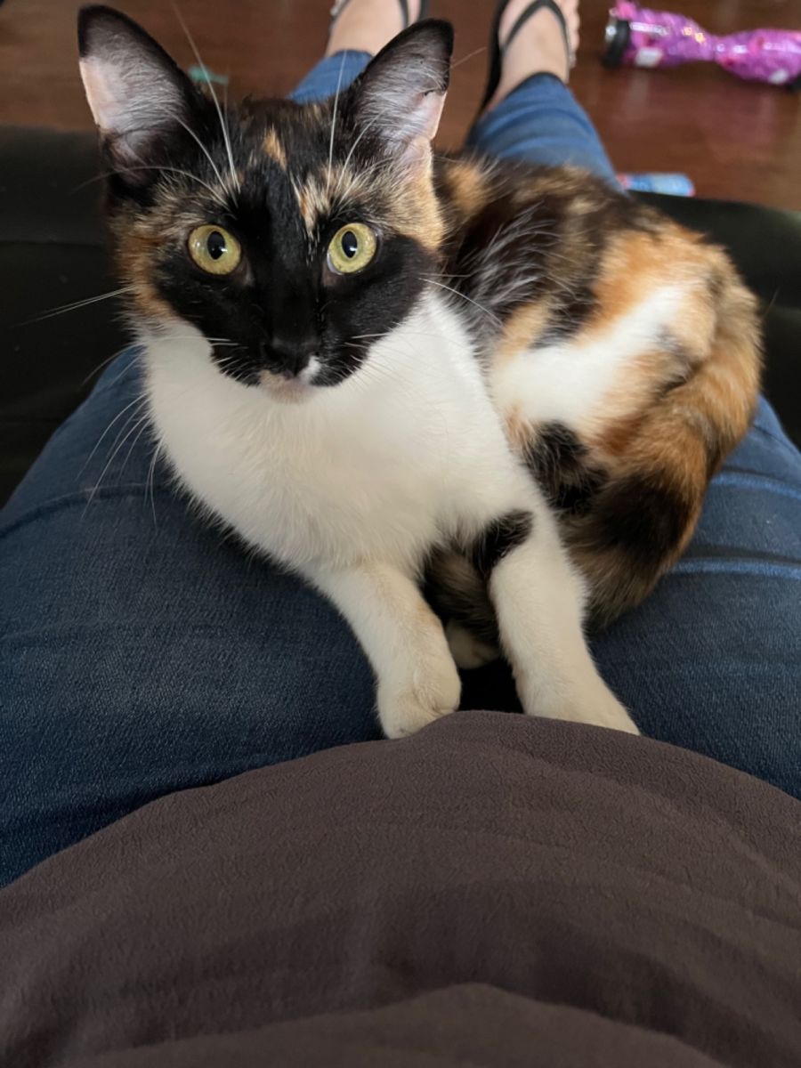 Cardi now confidently seeks out her foster mums lap for a cuddle after her dinner.