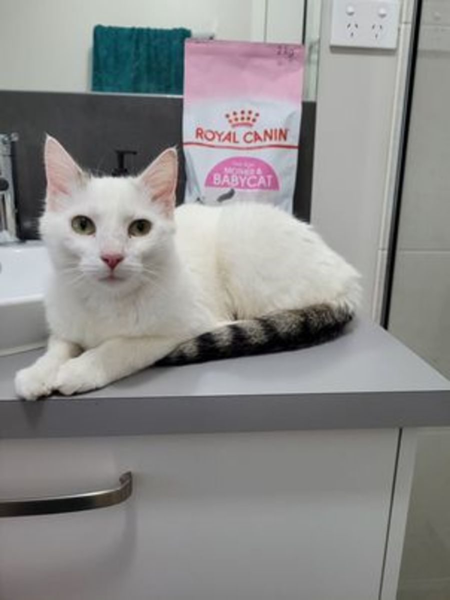 As she has pretty white fur, she will need to find a home where she is inside only or have a covered outdoor area to protect her from the sun.