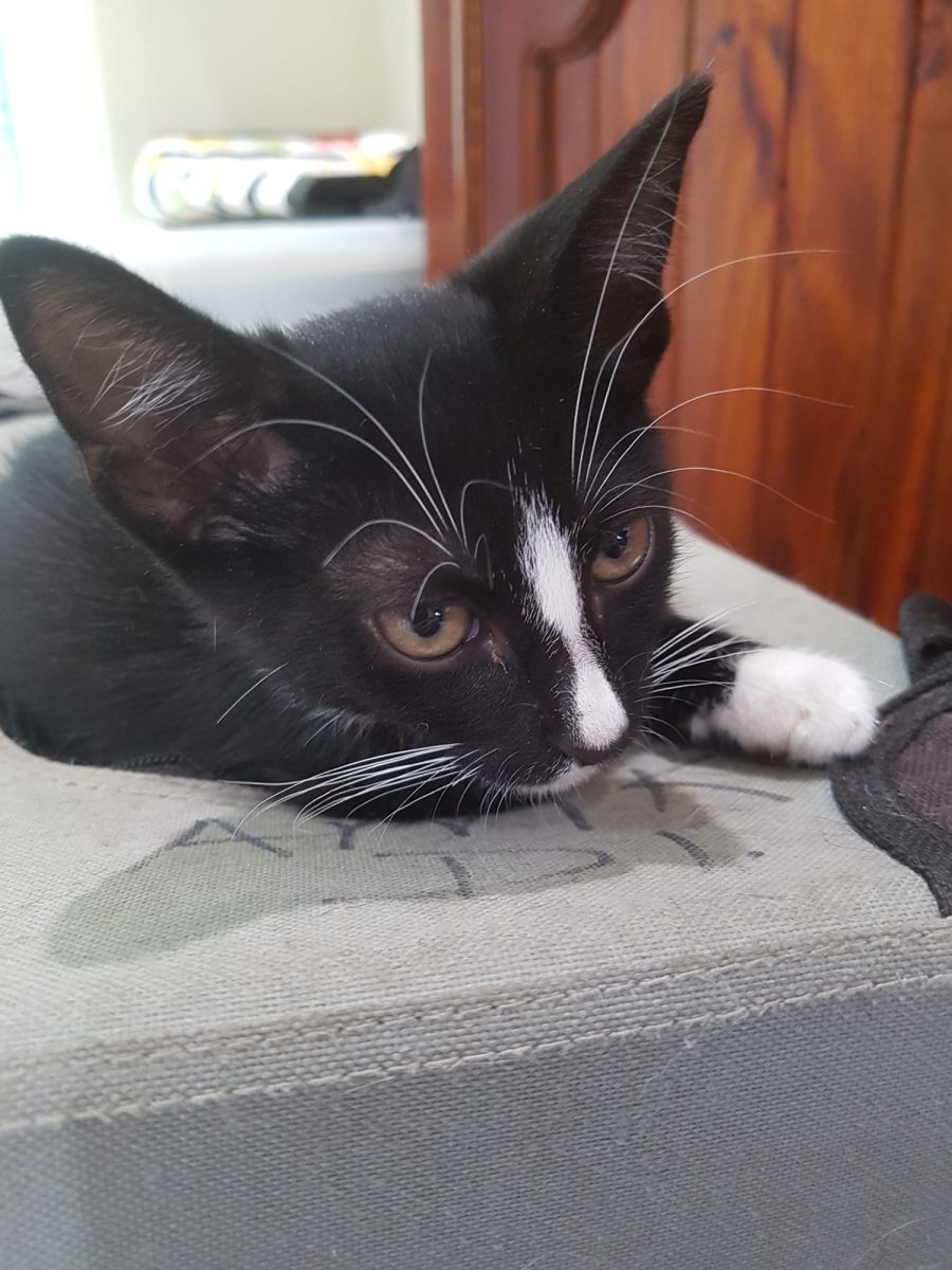 After being found in Portsmith he is adjusting well to being inside, loved and cuddled. He likes to check out the kitchen activity and cries if he thinks he's been left out. Within a few moments of pats or cuddles starting he will start purring.