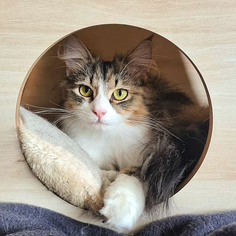 Floofypants is a cheeky girl who adores her humans. She loves playing pounce, catch the hoomans toes and wakey wakey its time for pats! She absolutely must get a spot on the bed where she can boop her nose for pats! She enjoys interacting with her foster feline siblings too.... however her favourite friend in the home is her foster dog brother Klaus! Floofy loves playing with her canine foster brother and she hopes her forever home will have a friendly canine for her to love just as much!