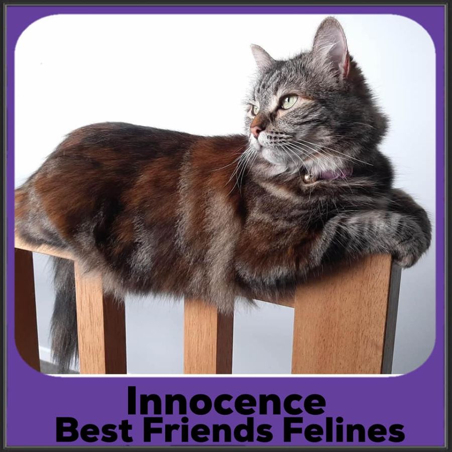 Innocence, despite her name can be a playful kitten full of mischief. She will run to greet you and chatter away, telling you all about her day. While not much of a lapcat, she definitely enjoys cuddles and head scratches. She has one of the loudest purrs I have ever heard on a cat, especially for one her size.