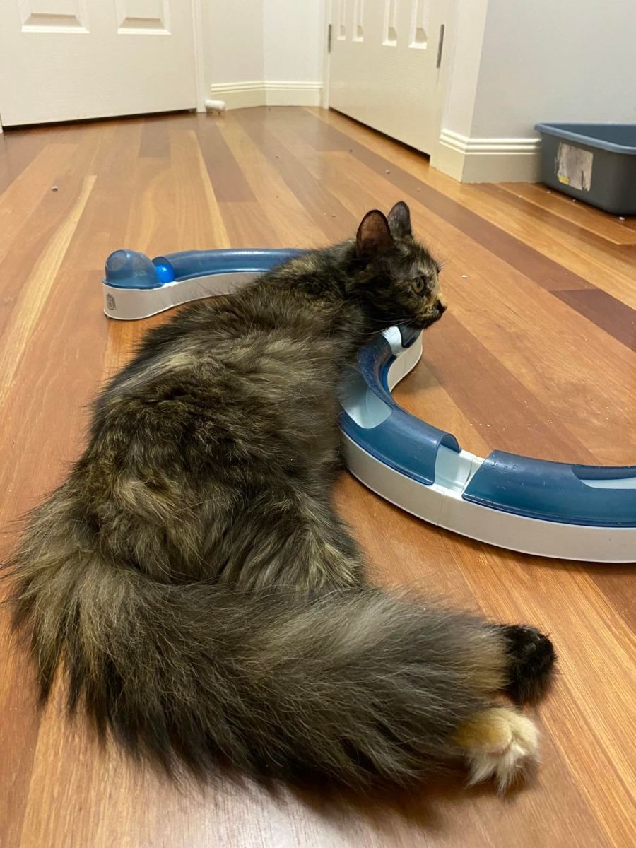 Possum is a true lady. Possum arrived into care when she was pregnant with her kittens and now she’s finished raising them she thinks she’s a kitten herself and is super affectionate and playful. Now it’s Possum’s turn to find her forever home! Possum would love to be with a family who will give her lots of love and attention. She’s extremely affectionate and loves to be picked up and cuddled. Possum loves playing with the cat toys and is a very young cat with a lot of years of love to give. If you are looking for a well behaved, affectionate companion maybe Possum is the friend you’ve been looking for.