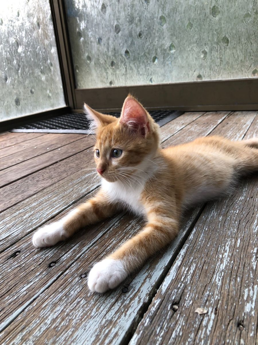 "Shishamo" is an outgoing, energetic kitten who loves to play. He’ll be your own mini Tiger cub. He’s a Ginger tabby kitten with 4 white socks and white chest. He loves playing with cat toys and balls. He also loves smooches and affection. He loves the company of his 4 siblings and a resident adult cat. Shishamo and his siblings are very good natured and lots of fun. He is currently in foster care in Carina.