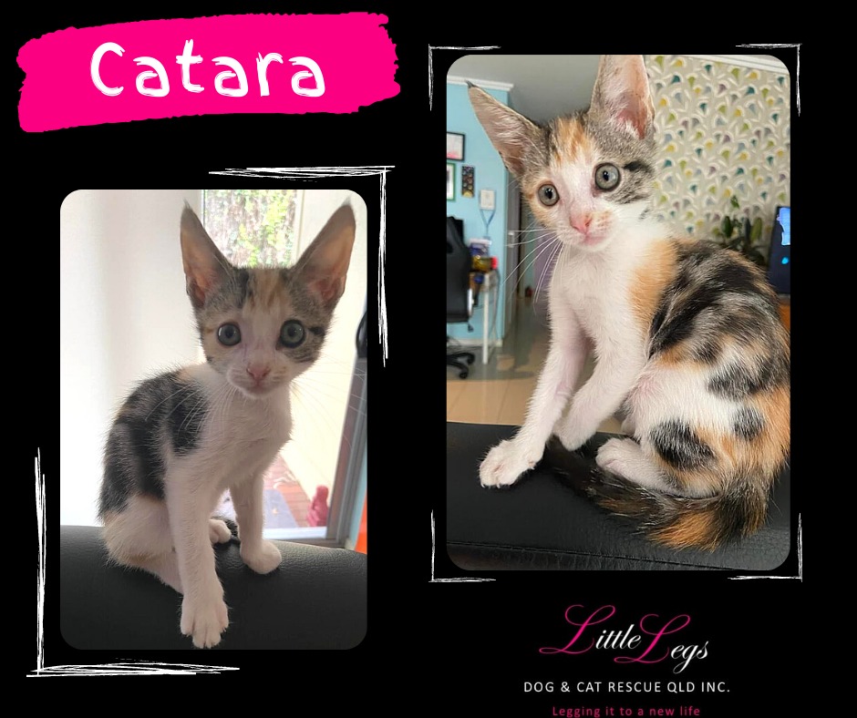 Hi, my name is Catara and I am a super sweet and affectionate little girl. I am petite and the VET thinks I maybe oriental, sounds exotic right?! I am calico in colouring which is a girl thing, go girl power! I am really affectionate, love curling up on your lap and love to play with my kitten toys, I am adventurous and you will find me exploring the nooks and crannies of your place but am always on the look out for you to play or snuggle with. I would be fine on my own or with other pets, I especially like my young humans and snuggle with them every chance I get.