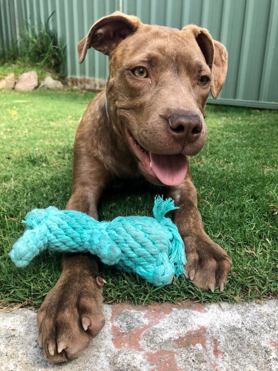 Opi sleeps soundly through the night in her crate often taking herself to bed. During the day she has access to the outdoors through a doggy door and is fully toilet trained. She's an affectionate little lady who likes to nap next to her foster sibling or on her foster parents often showering them with licks before dozing off. As much as she loves playing with her foster sibling, Opi also enjoys her own company. She'll happily lie on her outdoor bed chewing her rope or chase a ball around in the backyard.