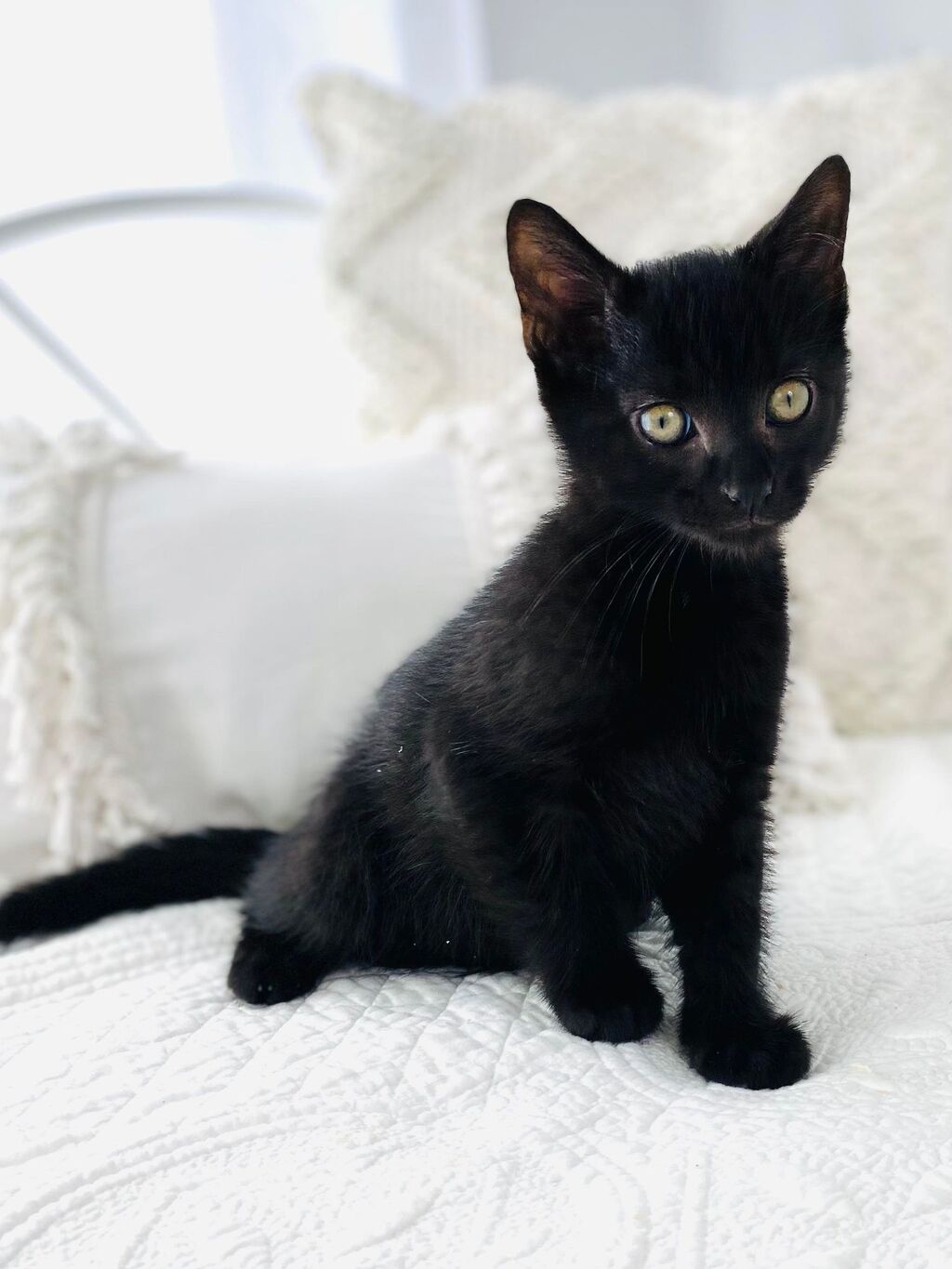 Pan is the handsome and sleek little house panther who loves to play! Pan will chase a toy for hours and hours on end and then absolutely konk out in a nice quiet, cosy spot. Pan is a bit more reserved than his brother Pico, and a tad less adventurous. He will likely take his time to check out and adapt to a new environment and need lots of love and encouragement along the way. Once Pan knows you and has developed confidence in his new environment he will be the king of human lap snuggles and the best little sidekick ever.