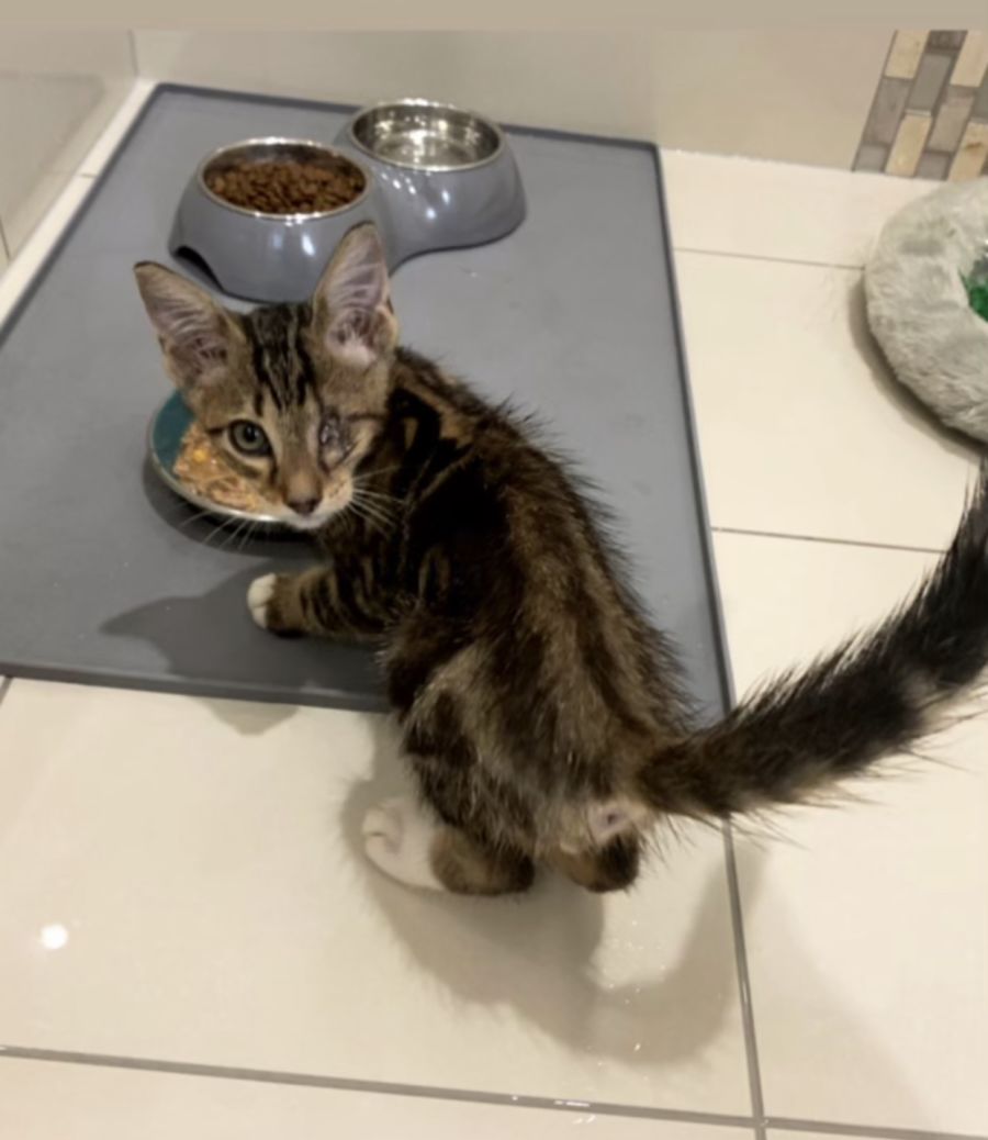 A furious little tiger. The one eyed bandit. Very playful. Loves to climb. Will climb up your leg for a cuddle. Has no fear. Loves his tower of cardboard boxes and jumping off them. Loves doing zoomies through the lounge room. He’s a beauty.