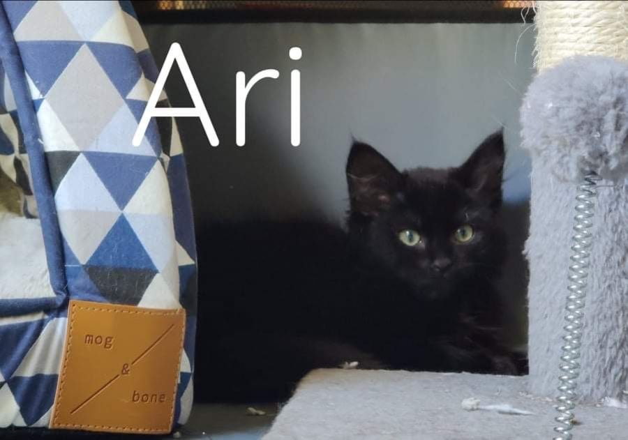 Ari (black male- 11 weeks) is still unsure about humans. He is growing in confidence every day and is learning a lot from his kitty siblings, but is still getting a hang of playing with toys and still has trust issues with humans. Once he is cuddled up with you he relaxes and really enjoys chin scratches, but he does not like hands reaching to pick him up. He has a lovely quiet personality and would be great for a peaceful house with lots of love and attention. He has definitely won our hearts (not quite sure we have won his yet!!)