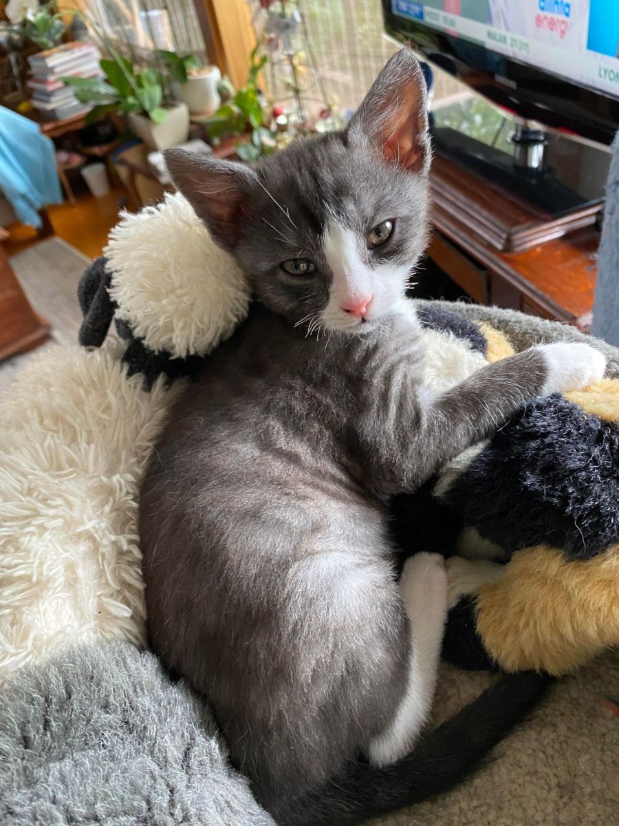 Stanley was bottlefed so he is used to humans and is a cuddly, happy, and very sweet little boy. He loves to play and keep people company by snuggling on their lap or at their feet.