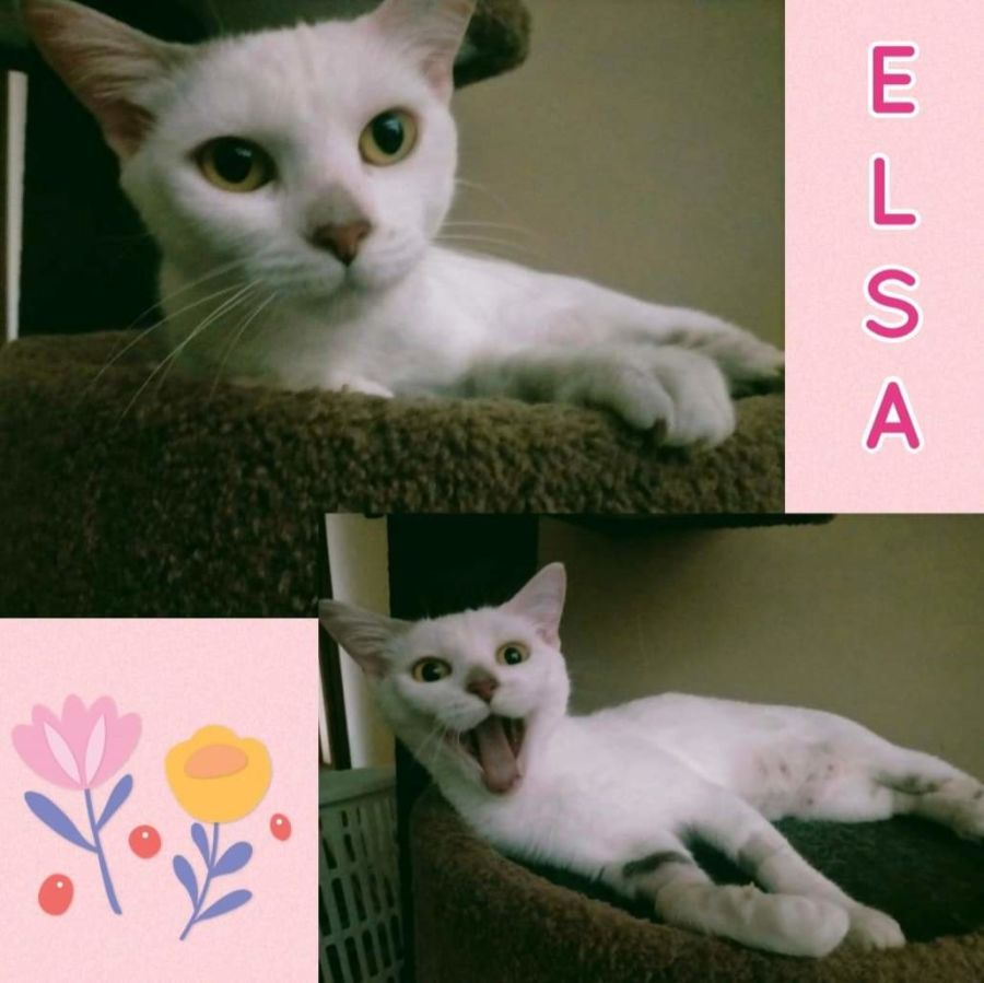 Elsa is a sweet loyal little girl. She will follow you where ever you go just so she can sit and nap at your feet. She isn't fond of other cats but she hasn't met a single person she doesn't love and she will tolerate dogs.