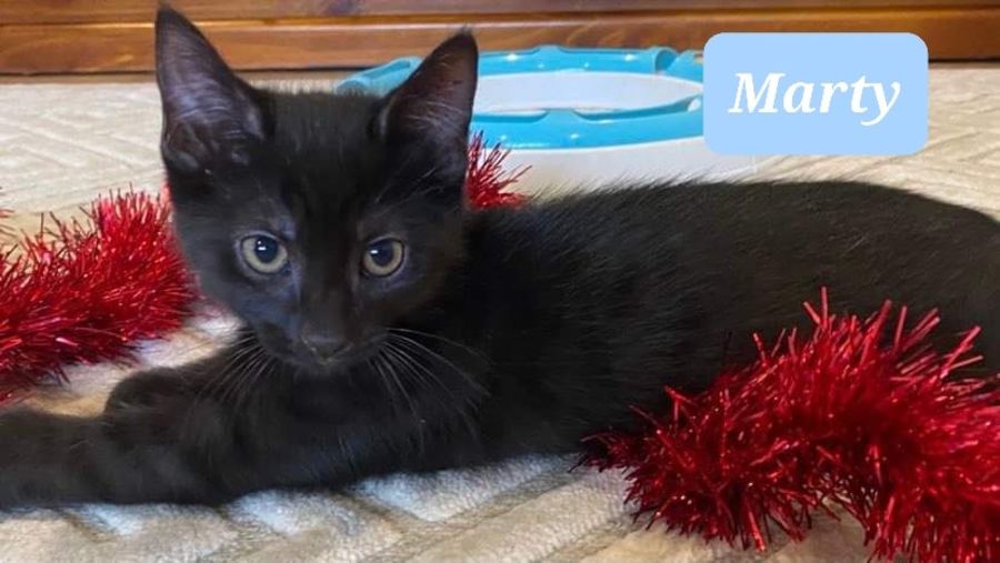 Marty is black with clear tabby stripes dabbled in his undercoat. Quite a spectacular kitten to look at.