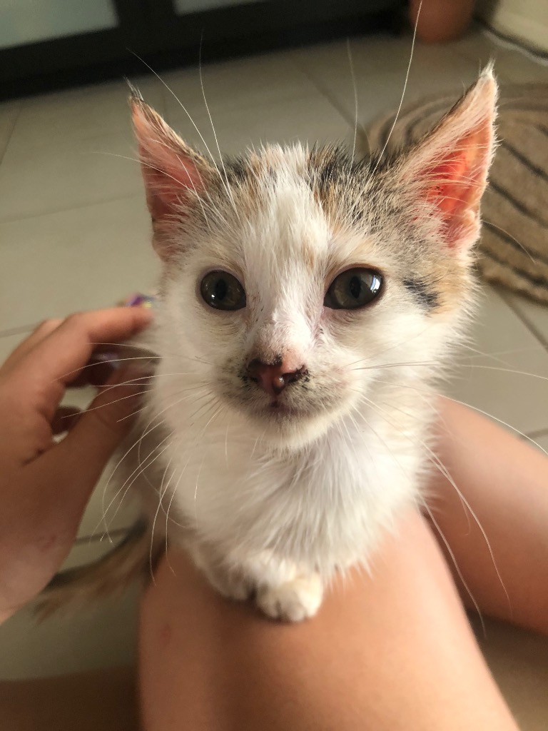 Very kindhearted little cat, she doesn’t scratch or have a mean bone in her body.
