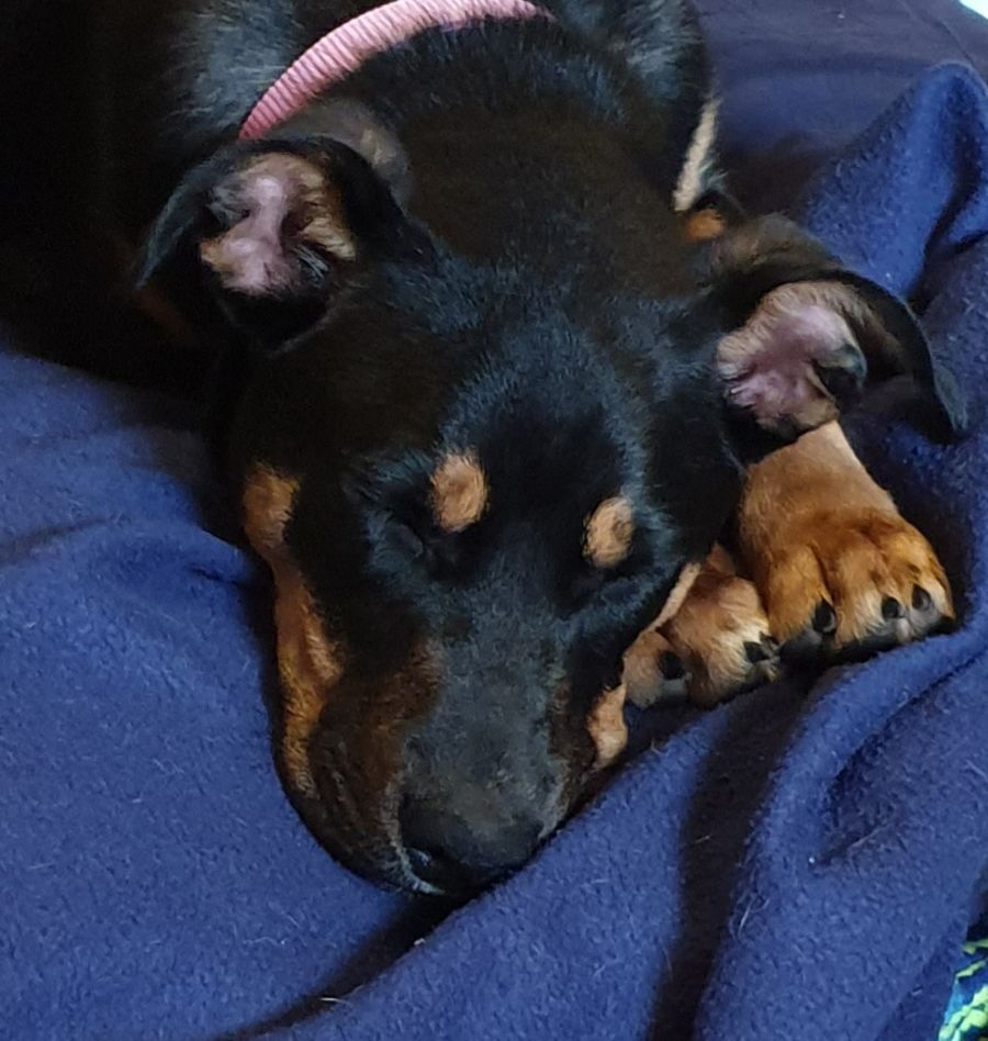 Priscilla is very food driven and is already responding to simple commands like “sit”. We are working on her toilet training and making good progress but this will need continued support. She is really eager to please so will be a great with any kind of training. She is a little jumpy but also super gentle in her jumpiness. She is not mouthy at all!