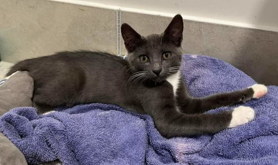 Want a sleek grey and white lap kitten? I am him! I am a typical kitten who loves playing, zooming around, climbing, eating and sleeping. Did I mention I love playing? Yes? Great...hope you have lots of toys for me!